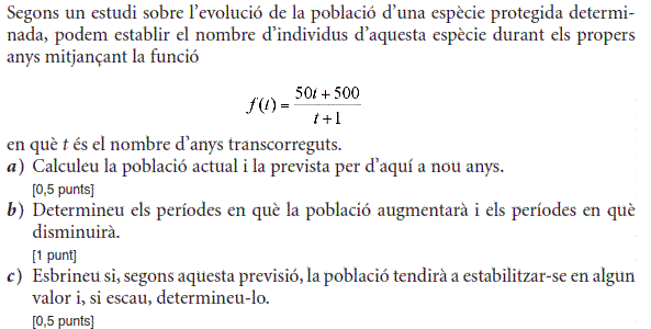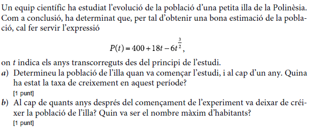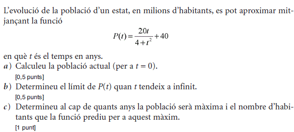 b) Trobeu quin ha de ser el preu del patinet per tal d’obtenir els ingressos màxims. Trobeu també el nombre de patinets que es vendran i els ingressos que s’obtindran amb aquest preu. [1 punt] - 2019 - Setembre - sèrie 5 - 3. Es preveu un canvi important en la població d’una determinada zona per qüestions mediambientals. El nombre d’habitants de la zona, en milions, vindrà donat per la funció `P(t)=(t^2+28)/(t+2)^2`, en què `t` mesura el temps en anys des del moment actual `(t = 0)`.