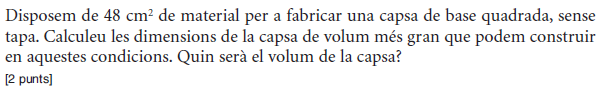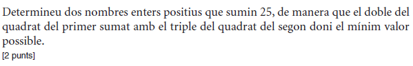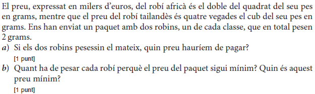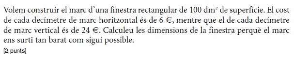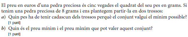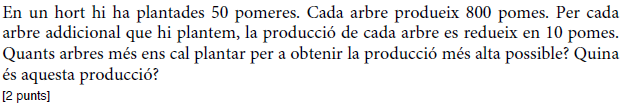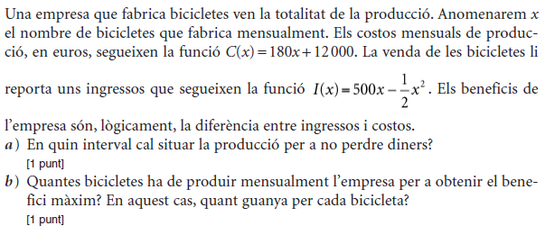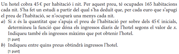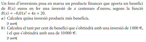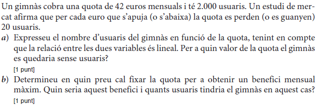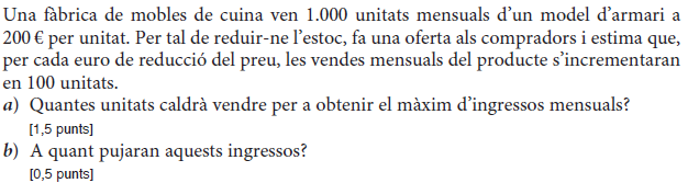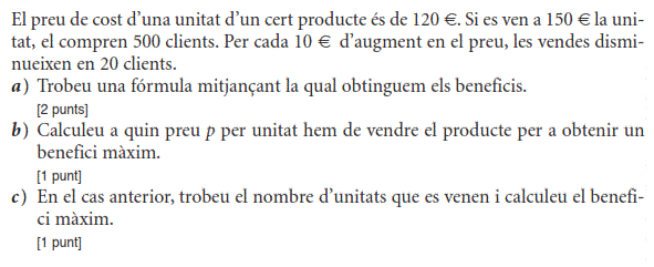 [1 punt] b) Determineu el preu de venda que fa màxims els beneficis del comerciant i justifiqueu que és un màxim. Determineu quantes unitats vendrà. [1 punt] - 2019 - Setembre - sèrie 5 - 2. Per a la campanya d’aquest estiu, una botiga d’esports que ven patinets elèctrics espera vendre `40` patinets a un preu de `1.000 €` per patinet. Segons un estudi de mercat, la relació entre el nombre de vegades que es rebaixa el preu del patinet en `50 €` i el nombre de patinets venuts és lineal, i, per cada `50 €` de rebaixa en el preu de venda de cada patinet, hi haurà un increment de les vendes de `10` patinets més.