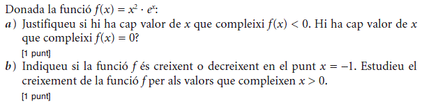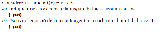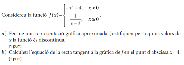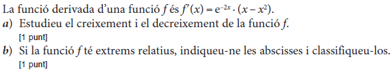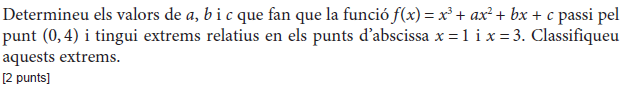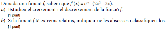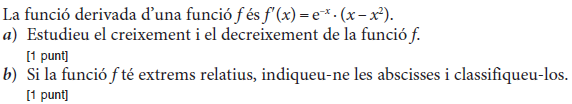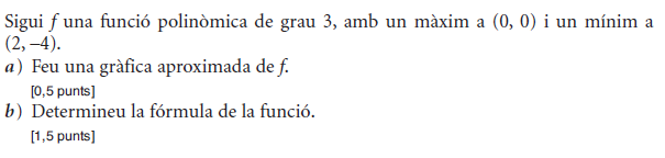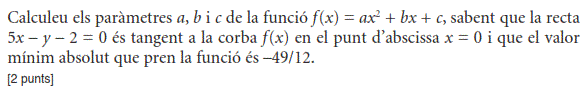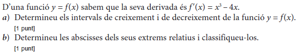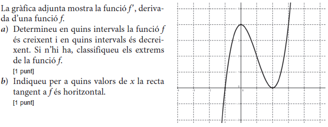 b) Si sabem que la gràfica de la funció `f(x)` passa pel punt `(0, 3)`, trobeu l’equació de la recta tangent a `f(x)` en aquest punt. [1 punt] - Sigui `f (x) = 2x^3 – x^2 + 3x + 1`. Donades les rectes `r_1: y = x + 2` i `r_2: y = 7x – 2`: a) Expliqueu, raonadament, si alguna de les dues rectes pot ser tangent a la corba `y = f (x)` en algun punt. b) En cas que alguna d’elles ho sigui, trobeu el punt de tangència. [1 punt per cada apartat] - Considereu la funció real de variable real, `f(x)=(2x^3)/(x^2-1)`. a) Trobeu-ne el domini. b) Calculeu l’equació de les seves asímptotes, si en té. c) Estudieu-ne els intervals de creixement i de decreixement, així com les abscisses els seus extrems relatius, si en té, i classifiqueu-los. [0,5 punts per l’apartat a; 1,5 punts per l’apartat b; 2 punts per l’apartat c] - Sigui `P(x) = ax^2+ bx + c` un polinomi qualsevol de segon grau. a) Trobeu la relació existent entre els paràmetres `a`, `b` i `c` sabent que es compleix que `P(1) = 0` i `P(2) = 0`. b) Quan es compleix la condició anterior, indiqueu quins valors pot tenir `P'(3/2)`. [1 punt per cada apartat] - Sigui `f (x)=x^2 · e^(–ax)` quan `a≠0`. a) Calculeu el valor de a perquè aquesta funció tingui un extrem relatiu en el punt d’abscissa `x=2`. b) Quan `a=2`, classifiqueu-ne els extrems relatius. [1 punt per cada apartat] - La gràfica corresponent a la derivada d'una funció f(x) és la següent: a) Expliqueu raonadament quins valors de `x` corresponen a màxims o a mínims de relatius de `f(x)`. b) Determineu els intervals de creixement i decreixement de la funció `f(x)`. [1,5 punts per l'apartat a; 0,5 punts per l'apartat b] |