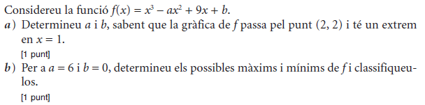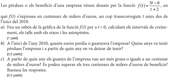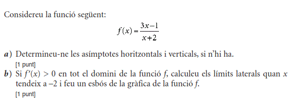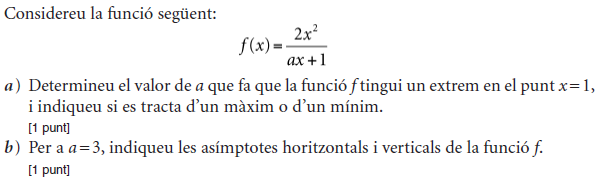 [0,75 punts] b) Quin dia del mes de febrer es van vendre més perfums i quantes unitats se’n van vendre? [1,25 punts] - 2019 - Juny - sèrie 4 - 1. Considereu la funció `f(x)=2x^3+ax`. Calculeu el valor de la constant `a` per tal que aquesta funció tingui un extrem relatiu en el punt d’abscissa `x = –1`. Digueu si es tracta d’un màxim o d’un mínim i doneu també el valor que pren la funció `f(x)` en aquest punt. [2 punts] - 2019 - Juny - sèrie 4 - 3. Un nutricionista, després de fer un estudi personalitzat a un pacient, li proposa una dieta. Segons el model del nutricionista, el pes en kilograms del pacient seguirà la funció `f(x)=(63x+510)/(x+6)`, en què `x` denota el nombre de mesos que fa que segueix la dieta.
