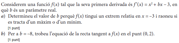 b) En quin moment s’arribarà al nombre mínim d’habitants? Quants habitants hi haurà en aquell moment? Quin és el nombre màxim d’habitants que s’assoleix en aquesta zona? [1 punt] - 2019 - Setembre - sèrie 5 - 5. Considereu una funció `f(x)` que té com a primera derivada `f'(x) = 2x^2 + bx + 4`, en què `b` és un paràmetre real.